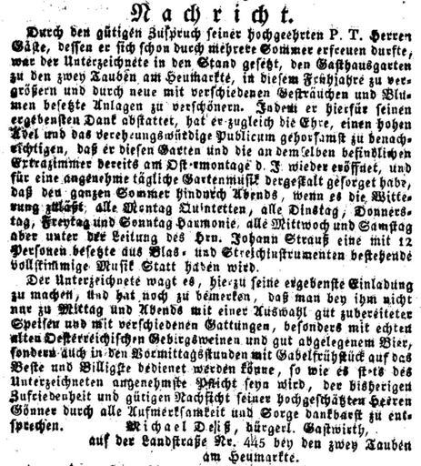 Keywords: Johann Strauß Vater - Intelligenzblatt 1827-05-07.jpg en Advertisement of innkeeper Michael Deliss in wich he annouce the appearance of Johann Strauss senior every Wednesday and Saturday de Anzeige von Michael Deliß in welcher er die Auftritte von Johann Strauß Vater jeden Mittwoch und Samstag ankündigt Allgemeines Intelligenzblatt zur Oesterreichisch-Kaiserlichen privil Wiener-Zeitung; Nr 105 Montag den 7 May 1827 S 741 http //anno onb ac at/cgi-content/anno apm 0 aid wrz datum 18270507 seite 13 zoom 2 anno onb ac at Michael Deliß 1827-05-27 Information field Transcription <poem> ſ long s; italics not original Nachricht Durch den gütigen Zuſpruch seiner hochgeehrten P T Herren Gäste deſſen er sich schon durch mehrere Sommer erfreuen durfte war der Unterzeichnete in den Stand geſetzt den Gasthausgarten zu den zwey Tauben am Heumarkte in dieſem Frühjahre zu ver- grüßern und durch neue mit verſchiedenen Geſträuchen und Blu- men besetzte Anlagen zu verſchönern Indem er hierfür ſeinen ergebenſten Dank abstattet hat er zugleich die Ehre einen hohen Adel und das verehrungswürdige Publicum gehorſamſt zu benach- richtigen daß er dieſen Garten und die an demſelben befindlichen Extrazimmer bereits am Oſtermontage d J wieder eröffnet und für eine angenehme tägliche Gartenmuſik dergestalt geſorget habe daß den ganzen Sommer hindurch Abends wenn es die Witte- rung zuläßt alle Montag Quintetten alle Dinstag Donners- tag Freytag und Sonntag Harmonie alle Mittwoch und Samſtag aber unter der Leitung des Hrn Johann Strauß eine mit 12 Personen besetzte aus Blas- und Streichinſtrumenten bestehende vollſtimmige Muſik Statt haben wird Der Unterzeichnete wagt es hierzu ſeine ergebenſte Einladung zu machen und hat noch zu bemerken daß man bey ihm nicht nur zu Mittag und Abends mit einer Auswahl gut zubereiteter Speiſen und mit verſchiedenen Gattungen beſonders mit echten alten Oesterreichiſchen Gebirgsweinen und gut abgelegenem Bier ſondern auch in den Vormittagsſtunden mit Gabelfrühſtück auf das Beſte und Billigſte bedienet werden könne ſo wie es ſtets des Unterzeichneten angenehmſte Pflicht seyn wird der bisherigen Zufriedenheit und gütigen Nachſicht ſeiner hochgeſchätzten Herren Gönner durch alle Aufmerkſamkeit und Sorge dankbarſt zu ent- ſprechen Michael Deliß bürgerl Gaſtwirth auf der Landſtraße Nr 445 bey den zwey Tauben am Heumarkte </poem> PD-old Johann Strauss I |