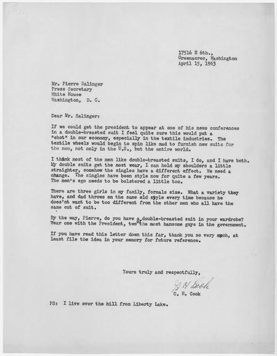 | Keywords: John F. Kennedy and Suits - NARA - 194141.tif Scope and content Letter from writer asking that President Kennedy wear a double breasted suit for one of his news conferences General notes 194141 Local identifier President 1961-1963 Kennedy Office of the President 01/20/1961 - 11/22/1963 John F Kennedy Library NLJFK Columbia Point Boston MA 02125-3398 1963-04-15 Record group Collection JFK-WHCF Papers of President Kennedy White House Central Files 01/20/1961 - 11/22/1963 Record group ARC 1176 Papers of President Kennedy White House Central Files White House Subject File compiled 01/20/1961 - 11/22/1963 Series ARC 194123 File unit Papers of President Kennedy White House Central Files White House Subject Files President 01/20/1961 - 11/22/1963 File unit ARC 194135 Variant control numbers NAIL Control Number NLK-WHCF-SBJCTFL-PP1310GWEARAPP-LTRREJFKSUITA yes Other versions NARA-cooperation PD-USGov Documents in English Documents related to John F Kennedy |