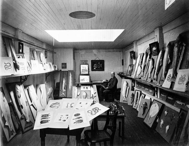 | Keywords: smithsonian institution smithsonianinstitution artstudio painting artist john h. richard johnhrichard naturalhistory bw film studio illustrator fishery 1879 berlin international fishery exhibition berlininternationalfisheryexhibition gallery museum library photos smithsonian institution archives smithsonianinstitutionarchives blackandwhite monochrome indoor black and white Description: John H. Richard's studio in the East Range of the Smithsonian Institution Building. Richard was a French-born scientific illustrator and is seen here, approximately a year before his death, painting casts for the Berlin International Fishery Exhibition of 1880. The Smithsonian was awarded the grand prize for the fishery exhibition displaying Richard's work. Creator/Photographer: Unidentified photographer Medium: Black and white photographic print Dimensions: 10 in x 8 in Date: 1879 Repository: Smithsonian Institution Archives Accession number: 82-3228 Description: John H. Richard's studio in the East Range of the Smithsonian Institution Building. Richard was a French-born scientific illustrator and is seen here, approximately a year before his death, painting casts for the Berlin International Fishery Exhibition of 1880. The Smithsonian was awarded the grand prize for the fishery exhibition displaying Richard's work. Creator/Photographer: Unidentified photographer Medium: Black and white photographic print Dimensions: 10 in x 8 in Date: 1879 Repository: Smithsonian Institution Archives Accession number: 82-3228 |