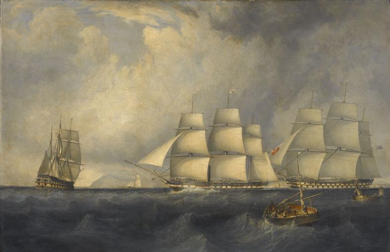 | Keywords: John Lynn - The 'Vernon' and other vessels.jpg John Lynn British active early 19th century Title The 'Vernon' and other vessels HM Ships ' w HMS Edinburgh 1811 Edinburgh ' and ' The painting showing the steam auxiliary 'Blackwall frigate' East Indiaman 'Vernon' 996 tons broadside in the centre on her maiden voyage She passing HM ships 'Edinburgh' and 'Blenheim' as they beat down Channel off Bembridge Isle of Wight on 21 September 1839 1839 Oil on canvas cm 99 137 1 institution National Maritime Museum Not on display BHC3686 Credit line Green Blackwall Collection http //collections rmg co uk/collections/objects/15159 html Royal Museums Greenwich Other versions http //collections rmg co uk/mediaLib/402/media-402050/large jpg a etching/aquatint after this painting in the NNM Object ID PAI6595 PD-old-100 John Lynn painter Paintings in the National Maritime Museum London Vernon ship 1839 19th-century sailing ships in paintings Blenheim ship 1813 |