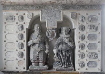 Keywords: John&MaryFortescueWeareGiffard.jpg en Figures of John Fortescue and his wife Mary Speccot Fortescue mural monument Weare Giffard Church Devon own photo own photo 1638; photo Apr 2012 Holy Trinity church Weare Giffard Wall mounted church monuments in Devon |
