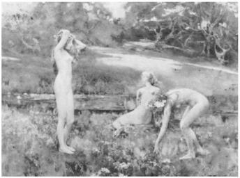 Keywords: John Reinhard Weguelin–Spring Blossoms and Youth (1904).png en Three young women gather flowers to decorate their hair All three are nude One stands fixing a garland in her long hair while one stoops to pick more flowers and a third is seated on the ground her back to the viewer Beyond them is a hillside with trees and sunlight 1904 Old painting/drawing Creator John Reinhard Weguelin other versions PD-old-auto-1923 1927 Uploaded with UploadWizard John Reinhard Weguelin Paintings of women Nude women in art Paintings of nude women Paintings of nude women in nature Paintings of nude women standing outdoors Paintings of nude women sitting outdoors Paintings of women with flowers Nude or partially nude women with flowers |