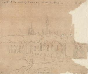 Keywords: John Robert Cozens - Part of the Wall of Rome Near the Villa Medici - Google Art Project.jpg Inscribed in artist's hand in graphite upper left Part of the wall of Rome near the Villa Medici ; in graphite upper right KK ; in graphite lower left 3 ; on verso in graphite lower right 4414 Inscription _Signed_and_Dated not signed Not on View Graphite and varnish on thin slightly textured beige laid paper Grand Tour domes walls trees landscape special url_id mQGACbxdkoscBw PD-old-100-1923 1799 Lazio in art by John Robert Cozens Google Art Project works by John Robert Cozens |