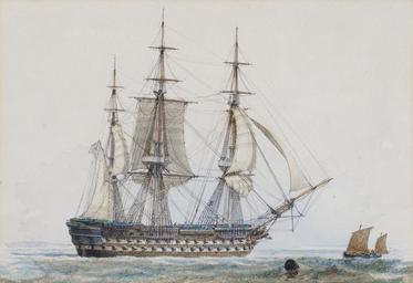 Keywords: John Ward of Hull - H.M.S. Asia.jpg John Ward of Hull 1798-1849 other date pen indian ink and watercolour heightened with white cm 13 8 20 3 object history credit line <small> H M S Asia often known as 'the pride of the Bombay yard' was a modified version of the 84-gun two-decker Formidable whose lines had been taken from the captured French Canopus and skilfully adapted by Sir William Seppings One of her most distinctive features was Seppings' innovative rounded stern and it is primarily this characteristic which helps to identify this vessel in many paintings Asia along with her sisters Bombay and Ganges was built in Bombay and constructed of Indian teak for longevity Measured at 2 279 tons and classed as a Second Rate she was 196 feet in length with a 52 foot beam and mounted 84-guns including a main armament of 32-32pdrs on her gundeck Ordered in 1819 her keel was laid in January 1822 and she was launched on 19th January 1824 Upon completion she was sent to England and fitted out as flagship for Sir Edward Codrington C in C Mediterranean who took her out to join the fleet at Malta in 1826 <br/>Under Captain Edward Curzon her first taste of action was at Navarino in the autumn of 1827 All through the 1820s Greece had been trying to throw off Turkish rule and by 1827 the three great powers Britain France and Russia had formed an alliance to further this aim In an attempt to secure a peaceful solution Codrington was sent to negotiate with the Turkish Navy whose main fleet was lying in Navarino Bay on the Morean coast of Greece On 20th October 1827 he took his allied fleet into the bay in the hope of enforcing a truce merely by a show of strength but the plan had to be abandoned when Turkish ships opened fire and Codrington was forced to retaliate A furious action then ensued which resulted not only in a Turkish defeat with extremely heavy losses but also the attainment of Greek independence <br/>Asia was subsequently flagship in the Mediterranean for two further commissions took part in the operations off the Syrian coast in 1840 and was then flagship to Admiral Hornby in the South Pacific from 1847 52 After several years laid up at Portsmouth she was made Guardship there in 1859 and survived until finally broken up in 1908 <br/>This work was also used as the basis for one of Ward's lithographs although in it the artist incorporated a number of anchored warships into the background <br/>This watercolour shows the starboard side of the 2nd rate H M S Asia and can be related directly to Ward's lithograph series The following two lots almost certainly relate to it as well and represent subjects that were either rejected or never carried to a conclusion The interesting aspect is that although there is still the nautical detail we expect of Ward they show a freer execution than other watercolours seen by him They probably represent initial studies when a more painterly approach was possible than in the final stages of preparing the image for the stone which calls for precision and constraint <ref>http //www bonhams com/auctions/18783/lot/97/ Bonhams</ref> reflist </small> accession number http //www bonhams com/auctions/18783/lot/97/ Bonhams PD-Art-100 John Ward HMS Asia ship 1824 19th-century sailing ships in paintings Images from Bonhams 19th-century watercolor paintings 19th-century paintings location missing Ships under sail |