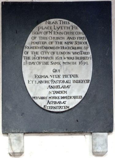 Keywords: JohnCruse Died 1692 SouthMoltonChurch Devon.PNG en Mural monument on north aisle wall of St Mary Magdalen's Church South Molton Devon to John Cruse d 1692 new style the first Master of the Free School founded in 1682 by Hugh Squier 1625-1710 in East Street South Molton Inscribed as follows Near this place lyeth the body of M aste r John Cruse curat e of this church and first Master of the new school founded endowed by Hugh Squire sic Esq of the City of London who died the 24th of March 1691 and was buried ye 29th day of the same month 1692 Qui eximia vitae pietate et labore pastorali indefesse anhelabat tandem per varios morbos immedicabiles aspirabat aeternitatem Who having been unwearied by distinguished piety and labour of a pastoral life was panting for and at last through various incurable diseases breathed-in Eternity own photo Lobsterthermidor <span class signature-talk ></span> 19 40 7 September 2015 UTC 2015 South Molton Wall mounted church monuments in Devon |