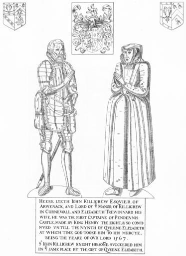 | Keywords: JohnKilligrew Died1567 St Budock's Church Budock Water Falmouth Cornwall.PNG en Monumental brass in St Budock's Church Budock Water near Falmouth Cornwall of John III Killigrew d 1567 of Arwenack near Falmouth first Governor of Pendennis Castle Falmouth appointed by King Henry VIII Inscription Heere lyeth John Killigrew Esquier of Arwenack and lord of ye manor of Killigrew in Cornewall and Elizabeth Trewinnard his wife He was the first Captaine of Pendennis Castle made by King Henry the eight and so continued untill the nynth of Queene Elizabeth at which time God tooke him to his mercye being the yeare of Our Lord 1567 S<sup>r</sup> John Killigrew Knight his son n e succeeded him in ye same place by the gift of Queene Elizabeth </br> See Dunkin Edwin Hadlow Wise The Monumental Brasses of Cornwall with Descriptive Geneaological and Heraldic Notes 1882 pp 36-7 His son Sir John IV Killigrew d 1583/4 of Arwennack succeded him as 2nd governor See Pedigree of Killigrew Vivian J L ed 1887 The Visitations of Cornwall comprising the Heralds' Visitations of 1530 1573 1620; with additions by J L Vivian Exeter p 268http //ukga org/england/Cornwall/visitations/p268 html Dunkin Edwin Hadlow Wise The Monumental Brasses of Cornwall with Descriptive Geneaological and Heraldic Notes 1882 pp 36-7 plate 31 Drawn by Dunkin Edwin Hadlow Wise 1882 Budock Water Monumental brasses in Cornwall Killigrew arms PD-old-100 |
