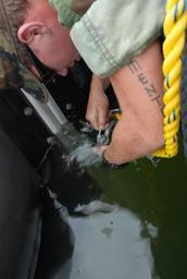 | Keywords: Joint service operation 080606-N-ZE676-089.jpg en U S Navy Seaman Zach Dilella stationed aboard Landing Craft Utility 1647 out of Little Creek Va fastens a shackle attached to and anchor line to secure the oil boom June 6 2008 The boom contains the possible release of pollutants from the submarine and to prevent boaters from entering the dive site U S Navy and Army divers along with federal state and local authorities participate in a joint service operation to raise the sunken former Russian submarine Juliett 484 at Collier Point Park in Providence R I Mobile Diving and Salvage Unit 2 Company 2-1 MDS CO 2-1 U S Army Dive Company and NAVSEA OOC Support Unit prepare to stabilize and recover the former Soviet cruise missile submarine that sank at her mooring point in about 30 feet of water during a nor'easter which struck Providence in April of 2007 This training exercise is part of the DoDs Innovative Readiness Training IRT program Through IRT military divers receive training by taking part of real-world community-based projects IRT and civil-military projects improve military readiness and help rebuild America U S Navy Photo by Mass Communication Specialist 1st Class David Crawford/ Released 2008-06-06 David Crawford https //www dvidshub net/image/1470022 080606-N-ZE676-089 2014-07-29 00 00 PROVIDENCE RI US PD-USGov-Military-Navy United States Navy Mobile Diving and Salvage Unit Two Images from DoD uploaded by Fæ |