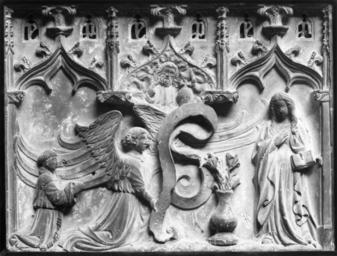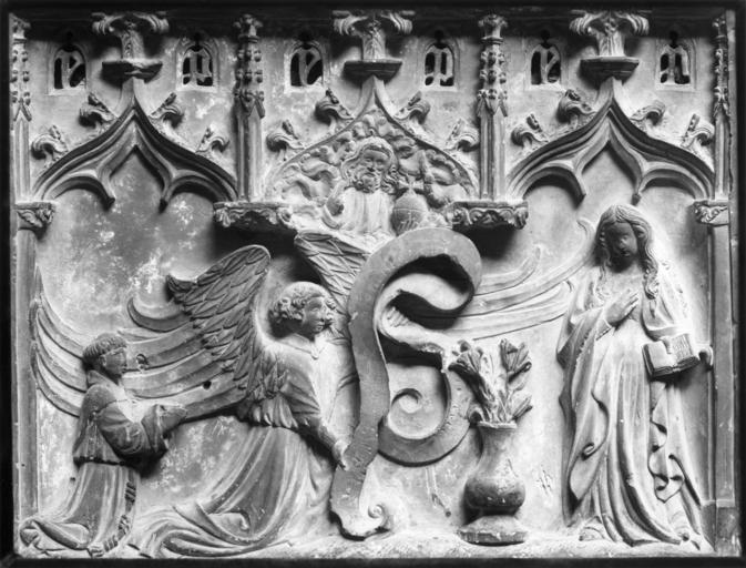 | Keywords: Joinville-Vignory Workshop - Annunciation - Walters 27301.jpg This relief is from an altarpiece that probably depicted the life of Christ The Archangel Gabriel appears to the Virgin carrying a scroll upon which his salutation Ave Maria gratia plena Hail Mary full of grace probably appeared as it does on the version below God the Father holds an orb representing the universe and blesses the event The vase of lilies an allusion to the Virgin's purity is often found in Annunciation scenes The flamboyant sweep of Gabriel's immense wings which encompasses the donor a Franciscan monk and gently caressing the Virgin is a feature shared with reliefs from a workshop that flourished from the 1390s to the 1440s in the neighboring towns of Joinville and Vignory in northeast France Most of these reliefs were intended to be painted There is a second relief from the same workshop in the Walters 27 253 between 1425 1430 Late Gothic limestone cm 32 5 43 2 ; Framed cm 36 46 5 7 8 accession number 27 301 1955 Jacques Seligmann Paris by purchase Henry Walters city Baltimore Walters Art Museum Henry Walters Acquired by Henry Walters 1911 place of origin Haute-Marne France Walters Art Museum license Renaissance reliefs in the Walters Art Museum Media contributed by the Walters Art Museum needs category review Joinville-Vignory Workshop Reliefs of the Annunciation |