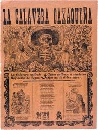 | Keywords: José Guadalupe Posada, Calavera oaxaqueña, broadsheet, 1903.jpg Calavera oaxaqueña by en José Guadalupe Posada Print shows a male skeleton dressed in a charro outfit wielding a machete among skulls and skeletons Includes song lyrics and cartoon skeleton figures Calaveras skulls are connected with the Mexican Día de los Muertos and Posada was the acknowledged master of the imagery of calaveras This image is named Calavera oaxaqueña the skull from Oaxaca likely after the rural get-up of the main figure LOC-image ppmsca 13238 Restoration by trialsanderrors http //www flickr com/photos/trialsanderrors/2713065295/ José Guadalupe Posada Calavera oaxaqueña broadsheet 1903 1903 Creator José Guadalupe Posada <gallery> File Posada 13238u jpg </gallery> PD-old-100 Skeletal decorations for Day of the Dead in Mexico José Guadalupe Posada |