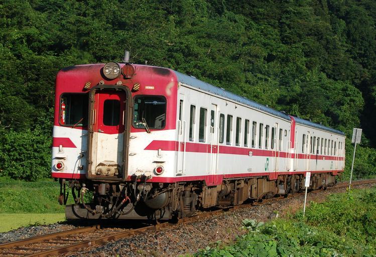 Keywords: JR East DC52 Morioka-color.jpg A pair of JR East KiHa 52 DMU cars in Morioka livery on the Iwaizumi Line JR 日 キハ52形盛岡 岩手和井内-中里間にて Own 2006-08-27 Sui-setz JNR Kiha 52 JR East Iwaizumi Line