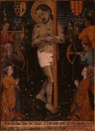| Keywords: Juan de peralta-martirio de san sebastian.JPG La obra representa el martirio de San Sebastián y a ambos lados del mártir se hallan los verdugos encargados de ejecutarle y las figuras orantes de don Gastón y doña María de la Cerda hijos de Luis de la Cerda el tercer conde de Medinaceli a los que se alude en la inscripción al pie de la escena En la parte superior se disponen dos escudos con las armas de la Casa de Medinaceli y de los Sarmiento respectivamente circa 1429 1430 oil on canvas Size cm 57 78 Institution Museo Cerralbo http //ceres mcu es/pages/Main accession number 01827 http //ceres mcu es/pages/Main PD-old-100 Paintings of Saint Sebastian in Spain 15th-century paintings of Saint Sebastian Juan de Sevilla 15th-century paintings in the Museo Cerralbo 15th-century works in Spain House of Medinaceli House of Sarmiento |
