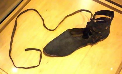 | Keywords: Judaic halizah shoe for declining to marry a childless widow, United States, New York, 20th century - Bata Shoe Museum - DSC00157.JPG Halizah shoe exhibit in the Bata Shoe Museum Toronto Ontario Canada; the museum permitted photography without restriction see also http //www jewishencyclopedia com/articles/7105-halizah JewishEncyclopedia com 1906 ḤALIẒAH žtaking off untying 2013-07-04 10 26 39 own Daderot cc-zero Shoes in the Bata Shoe Museum Uploaded with UploadWizard Halizah | ||||