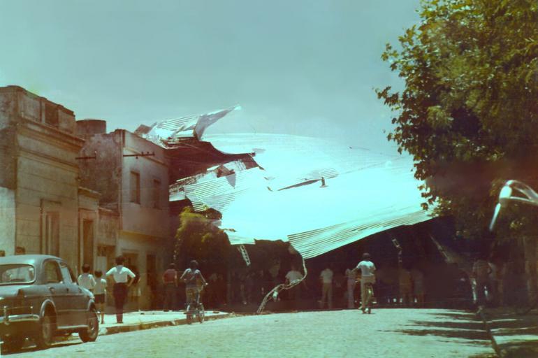 Keywords: Junín Huracán 19740104.jpg es Techo del gimnasio del Club Jorge Newbery en junín Argentina volado por una tormenta el 4 de enero de 1974 y depositado sobre la calle Italia entre España y Newbery own Germanramos actully my father 1974-01-04 Cc-zero FoP-Argentina Tornado de 1974 en Junín Históricas Club Jorge Newbery Junín in the 1970s