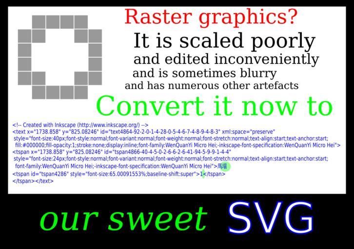 | Keywords: Junkscape.svg en Criticism of Inkscape designed in the style of a w demotivational poster Blue text shows a highly redundant if not w obfuscated SVG code borrowed from File Future-MTR-map svg often generated with Inkscape <font color 99FF99>Green ellipses</font> highlight two short text strings that the given slice of SVG code represents and anything more own Incnis Mrsi 2012-09-13 Created with CorelDRAW Converted to SVG svg Also used a piece of File Future-MTR-map svg ™s source code Wikimedia humor Wikimotivators Inkscape Cc-zero |