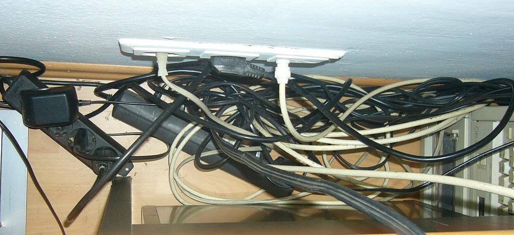 Keywords: Kabelsalat.JPG en Cable Salad a common trip hazzard at work and at home 2006-01-24 own User Mattes Tangled cables Taken with Panasonic Lumix DMC-LC50 Work by Mattes 2006 User Mattes/Contributions/Topics/Technology