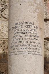 Keywords: Kafarnaum BW 22.jpg Kafarnaum Synagoge Inschrift an einer Säule Zum frommen Gedenken an Reverendus Pater Gaudentius Orfali vom Orden der Franziskaner durch dessen hingebungsvolle Mühe die Nordsteine der antiken Synagoge und vier Säulen an ihrem Platz wieder errichtet worden sind Er starb zwei Tage nach seinem Werk am 12 vor den Kalenden des Mai am 20 April im Jahr des Herrn 1926 Zu Gefallen Unter dem Beifall der Internationalen Archäologischen Vereinigung das Denkmalsamt Amt zur Pflege und Bewahrung der Altertümer Capernaum Synagogue inscription at a column To the pious memory of the Reverend Father Reverendi Patris Gaudentius Orfalus OFM by whose devout work the northern stones of the ancient synagogue and four columns were restored to their positions He died two days after his work on April 20 1926 own 2010-09-16 Berthold Werner ImageNote 1 311 716 1292 1503 1800 2700 2 PIAE MEMORIAE R P GAUDENTII ORFALI O F M CUIUS DEVOTA OPERA ANTIQUAE SYNAGOGAE LAPIDES SEPTEMTRIONALES ET QUATTUOR COLUMNAE SUIS RESTITUTAE SUNT SEDIBUS OBIT DIEBUS AB OPERE SUO DUOBUS XII KAL MAIAS AD MCMXXVI CONGRESSU ARCHEOL INTERNAT PLAUDENTE MAGISTRATUS ANTIQUITATIBUS CURANDIS TUENDIS Zum frommen Gedenken an Reverendus Pater Gaudentius Orfali vom Orden der Franziskaner durch dessen hingebungsvolle Mühe die Nordsteine der antiken Synagoge und vier Säulen an ihrem Platz wieder errichtet worden sind Er starb zwei Tage nach seinem Werk am 12 vor den Kalenden des Mai am 20 April im Jahr des Herrn 1926 Zu Gefallen Unter dem Beifall der Internationalen Archäologischen Vereinigung das Denkmalsamt Amt zur Pflege und Bewahrung der Altertümer To the pious memory of the Reverend Father Reverendi Patris Gaudentius Orfalus OFM by whose devout work the northern stones of the ancient synagogue and four columns were restored to their positions He died two days after his work on April 20 1926 ImageNoteEnd 1 QualityImage Photographs by User Berthold Werner/Israel Palestina Taken with Pentax K10D Capernaum byzantine synagogue Quality images by User Berthold Werner Quality images of Israel |
