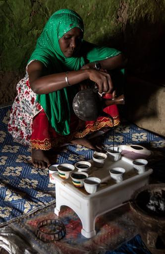Keywords: Värdinnan i hyddan häller upp kaffe. et kaffe afar dryck byggnader etiopien hyddor platserspecifika melkawerer platserallmänna