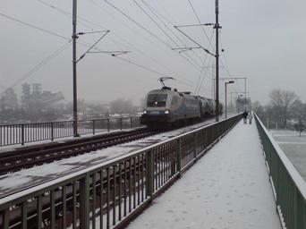 | Keywords: Kaiserbruecke With Train I.jpg The footpath / cycleway technically you have to wheel your bike across on the southern side of the Kaiserbrücke in Mainz Germany A train heading towards the Mainz side with some tanker rolling stock self-photographed 2007-12 Uploader Photos taken by Ingolfson Kaiserbrücke Winter 2007-2008 in Mainz Siemens ES 64 U 2 Tank trains in Germany Bikeway bridges in Germany Footbridges in Rhineland-Palatinate Rolling Stock of Mittelweserbahn 2007 in Mainz Tank railway wagons of Germany |