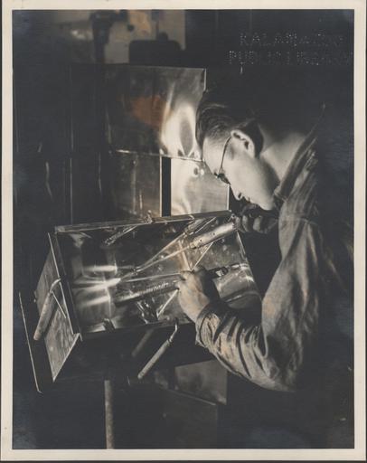 | Keywords: kalamazoo public library michigan history photography worker stove company factory manufacturing copper welding reservoir tank surreal photo border Interior of Kalamazoo Stove Company. Welding a seam into a copper reservoir tank. Unidentified man welding. For more information on the Kalamazoo Stove Company read: www.kpl.gov/local-history/business/kalamazoo-stove.aspx KPL catalogue number P-139. Interior of Kalamazoo Stove Company. Welding a seam into a copper reservoir tank. Unidentified man welding. For more information on the Kalamazoo Stove Company read: www.kpl.gov/local-history/business/kalamazoo-stove.aspx KPL catalogue number P-139. |