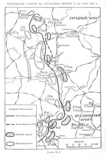 | Keywords: Kamenev map 4.jpg  ru Схема 4 Положение сто он на польском ф онте к 26 мая 1920 г С С Каменев Бо ьба с белой Польшей Военный вестник 1922 N12 ст 7-17 Записки о г ажданской войне и военном ст оительстве Воениздат 1963 С С Каменев 1922 PD-old Maps of the Polish-Soviet War |