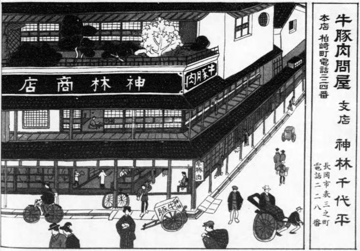 Keywords: Kanbayashi Meat Shop in Taishō era.jpg ja 大正 の神林商店(現・神林精肉店)(新潟 長岡市) 絵画北越商工便覧 井政太郎編 大正8(1919)年刊より Nagaoka Niigata Prefecture Japan in Taishō era 1919 絵画北越商工便覧 ( 井政太郎編 大正8(1919)年刊) 国立国会図書館デジタルコレクション Japanese book Kaiga Hokuetsu Shōkō Benran published in 1919 Collection of books of the National Diet Library Japan http //dl ndl go jp/info ndljp/pid/967293/56 NDL http //dl ndl go jp/info ndljp/pid/967293/56 井政太郎 other versions 図内の文字 Characters in this figure 牛豚肉問屋 支店 神林千代平 長岡市表三之町 電話二二八番 店 柏崎町電話二二四番<br> 牛豚肉 神林商店 Custom license marker 2016 10 03 PD-Japan Kaiga Hokuetsu Shōkō Benran |