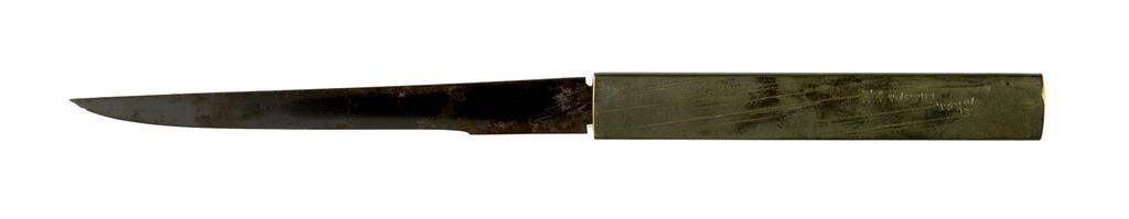 Keywords: Kano Natsuo - Kozuka with Man and Ox - Walters 5111994 - Back.jpg At the right of the composition a man is struggling to tie an ox to a tree This is part of a mounted set between 1828 1898 late Edo-Meiji silver gold shakudo copper alloy or sentoku cm 21 accession number 51 1199 4 21682 William T / Henry Walters Collection Baltimore date and mode of acquisition unknown Walters Art Museum Henry Walters Acquired by William T or Henry Walters Signature kita okina zu / natsuo place of origin Edo present-day Tokyo Japan Walters Art Museum license Tosogu Japanese sword fittings in the Walters Art Museum Kano Natsuo Media contributed by the Walters Art Museum needs category review |