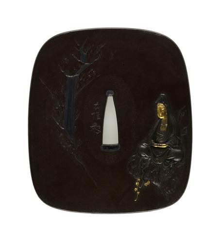 | Keywords: Kano Natsuo - Tsuba with the Bodhisattva Kannon - Walters 51218 - Back.jpg The bodhisattva Kannon sits on the right side of the tsuba While the bodhisattva is neither a man nor a woman depictions of this type have a distinctly feminine aspect She is called the White Robed Kannon because of her costume She sits near a waterfall Kannon is a compassionate deity who helps humans achieve Buddhahood The reverse of the tsuba depicts lotus flowers which are associated with Buddha and other Buddhist deities between 1848 1898 Edo-Meiji iron and brass with silver alloy and gold cm 8 5 accession number 51 218 39900 Henry Walters Baltimore date and mode of acquisition unknown Walters Art Museum Henry Walters Acquired by Henry Walters Signature Inscribed Natsuo kao ; Seal Inscribed Natsuo place of origin Edo present-day Tokyo Japan Walters Art Museum license Tsuba in the Walters Art Museum Kano Natsuo Media contributed by the Walters Art Museum needs category review |