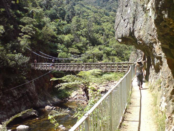 | Keywords: Karangahake Gorge Battery Area Photos 03.jpg The track of a former horse-drawn rail line hammered out of a cliff face in a side canyon off the Karangahake Gorge in New Zealand Looking east to where a suspension bridge connects the walking path nowadays used by tourists with the Windows Walk on the northern side of the canyon Coordinates are a bit approximate self-photographed 2011-01 Uploader 37 4277318 175 7245159 Photos taken by Ingolfson 2011 in New Zealand Waitawheta Gorge Suspension bridges in New Zealand Footbridges in New Zealand Mining railways in New Zealand Rivers of New Zealand Bridge railings Railings in New Zealand Walking paths in New Zealand Former railway lines in New Zealand Transport in the Waikato Region |