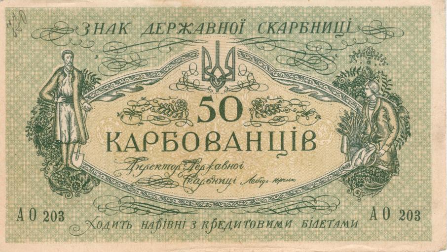 Keywords: Karbovanets 50 1918 b.jpg This is front face To see back face go to Image Karbovanets 50 1918 a jpg The Banknote of The State Treasury The period of circulation since April 1918 till may 1919 Size from 73 5x130 mm till 77x133 mm witout water-marks By the picture of A Krasovskyy Made in Odessa Ук аинские 50 ка бованцев 1918 года т н лебидь-ю чики Выпуск Цент альной Рады Одесса Аве с 1918 Естественные цвета <blockquote> на к асном сукне пачки п одолговатых бумажек зеленый иг альный к ап Знак де жавноi ска бницi 50 ка бованцiв ходить на iвнi з к едитовыми бiлетами а к апе селянин с обвисшими усами воо уженный лопатою и селянка с се пом а обо оте в овальной амке увеличенные к асноватые лица этого же селянина и селянки И тут че вяками усы вниз по-ук аински И надо всем п едосте егающая надпись За фальшування ка аеться тю мою уве енная подпись Ди екто де жавноi ска бницi Лебiдь-Ю чик ихаил Булгаков «Белая гва дия» 1924 </blockquote> own personal collection scan by Vizu 1918 \ 2008 The State Treasury UNR PD-UA-exempt banknotes PD-old Banknotes of Ukraine 1918 0050 Days of the Turbins Banknotes with a face value of 50 Green banknotes |