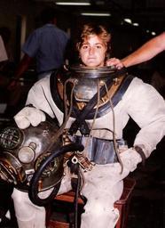 | Keywords: Karen Kohanowich.jpg Karen Kohanowich former U S Navy Salvage Diver Acting Director of NOAA's National Undersea Research Program NURP and NEEMO 10 aquanaut wearing a Mark V diving rig during her service in the Navy http //www history navy mil/museums/keyport/womendivers/Photos/Kohanowich_MkV jpg U S Navy PD-USGov-Military-Navy Karen Kohanowich Standard diving dress Women looking at viewer | ||||