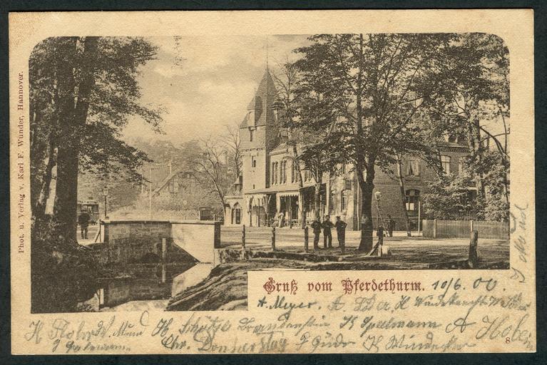 | Keywords: Karl F. Wunder PC 0008 Gruß vom Pferdethurm. Bildseite.jpg Eine der numerisch frühesten Ansichtskarten von Karl F Wunder Das zugrunde liegende Foto wurde vermutlich schon vor oder um 1898 aus der heutigen Kaulbachstraße aufgenommen - unter großer Anteilnahme der anwesenden Bevölkerung Ganz links sehen wir den ehemaligen Straßenbahn-Endpunkt Pferdebahn am Pferdeturm; die Person vor der Bahn dürfte mit Sicherheit der - männliche - Zugführer sein der sich an der damaligen Unterführung des Wolfsgrabens postiert hat Weiter rechts im Hintergrund ein altes Fachwerkhaus Davon rechts das Gebäude mit dem eigentlichen Pferdeturm als Ausflugsziel umgebaut zur Waldwirtschaft Die drei interessierten Knaben neben dem Kastanienbaum tragen neben ihren Mützen vermutlich noch die adrette Schuluniform Der Mann ganz rechts hat seine Arbeit unterbrochen; seine Leiter lehnt noch an der Gas- Laterne Scan durch Bernd Schwabe in Hannover vom vorgelegten Original ~ 1898 Karl Friedrich Wunder <gallery>File Karl F Wunder PC 0008 Gruß vom Pferdethurm Adressseite jpg</gallery> PD-old Pferdeturm Hannover Am Pferdeturm Hannover Kaulbachstraße Hannover Numbered postcards by Karl Friedrich Wunder Sperrwerk Wolfsgraben Hannover |