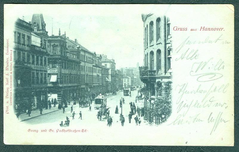 | Keywords: Karl F. Wunder PC 0005 Gruß aus Hannover. Georg- und Gr. Packhofstraßen-Eck. Mondscheinkarte. Lichtdruck v. Knackstedt & Näther, Hamburg. Bildseite.jpg Bildmotiv der Ansichtspostkarte von Karl Friedrich Wunder um 1898 Blick von der Ecke Bahnhofstraße/Kröpcke durch die Georgstraße über die Eckhäuser Große Packhofstraße in Richtung Steintor Nicht ein einziges der hier gezeigten Gebäude existiert heute noch lediglich die Straßenverläufe haben sich erhalten Selbst die beiden Eckhäuser an der Großen Packhofstraße im Vordergrund links wichen noch in der Kaiserzeit den Nachfolgebauten Georgstraße 22 und Georgstraße 24 die heute saniert sind und unter Denkmalschutz stehen Die im Jahr 1898 verwendete Karte siehe unten Rückseite der Karte wurde im Lichtdruck-Verfahren durch die Firma Knackstedt Näther mit Sitz in Hamburg gedruckt Die Vergrößerung offenbart teils überraschend klare Details Deutlich wird daß die Straßenbahnen nicht durch elektrische Beiwagen siehe Geschichte der Straßenbahn in Hannover angetrieben werden was jedoch nach der Literatur schon ab 1897 die Regel war Daraus folgt zwingend daß es sich erstens noch um den Betrieb von Pferdebahnen vor 1897 handeln muß und zweitens die zugrundeliegende Fotoplatte von dem Fotografen Karl F Wunder sehr viel früher belichtet wurde als der Poststempel vermuten ließ und drittens dieser Lichtdruck auch in der Vergrößerung dennoch so undeutlich ist daß nicht einmal die Pferde vor den Straßenbahnen eindeutig erkennbar sind Für detaillierte Forschungen präzisere Aussagen und den Transfer für zukünftige AHA-Erlebnisse in der Erweiterten Realität wären hier bestmögliche Scans der möglichst unverfälschten Originale hilfreich Und zwar als dauerhafte und für jeden jederzeit zugängliche Online-Veröffentlichung unserer Kulturgüter - den gemeinfreien wie auch den speziell lizensierten Als offensives Bildungsangebot nicht nur für unsere Jugend - so wie dieses bescheidene wie seltene Beispiel Scan durch Bernd Schwabe in Hannover vom vorgelegten Original circa 1898 Creator Karl Friedrich Wunder <gallery>File Karl F Wunder PC 0005 Gruß aus Hannover Georg- und Gr Packhofstraßen-Eck Mondscheinkarte Lichtdruck v Knackstedt Näther Hamburg Adressseite jpg</gallery> PD-old Numbered postcards by Karl Friedrich Wunder Georgstraße Hannover Große Packhofstraße Hannover 1897 in Hannover Knackstedt Näther Horse trams in Hannover |