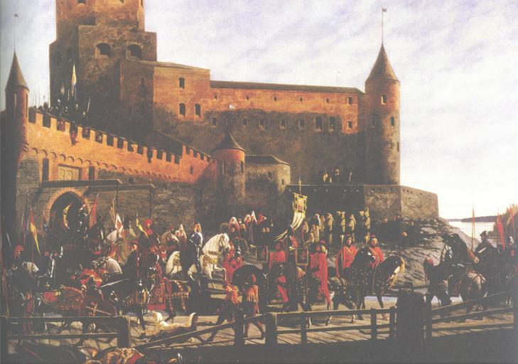 | Keywords: Karl Knutsson Bonde Viborgs slott kungaval Severin Falkman 001.jpg en Karl Knutsson Bonde leaves the Castle of Vyborg in order to participate in the election of a king in Sweden The national romantic message of the painting is that Finland played an important part in the political history of Sweden sv Karl Knutsson Bonde lämnar Viborgs slott för att delta i kungavalet i Sverige Det nationalromantiska budskapet är att Finland spelade en viktig roll i Sveriges politiska historia Kari Tarkiainen Sveriges Österland p 163 Severin Falkman 1880-86 The painting is situated in the palace of the President of Finland PD-Art Severin Falkman Finland in history paintings Charles VIII of Sweden Historical pictures of Vyborg Castle Horse transport in Vyborg Krepostnoy Bridge in Vyborg Paradise tower in Vyborg |