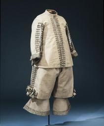 | Keywords: Karl X Gustavs kläder från 1650-talet - Livrustkammaren - 65026.tif LSH artwork sv Dräkten består av jacka byxor strövlingar kanoner och skorosor Materialet kallas i 1671 års inv grå Camlat hållandz d v s det är en brunaktig grå eller olivfärgad yllerips eller kamlott Dess vådbredd är ca 75 5 cm utan stad med 17x9 á 10 tr/cm2 Varpen består av 2 otvinnade trådar som tvinnats samman åt höger Inslaget består av 1 ljus och 1 mörk vänstertvinnad tråd av ylle Staden är ej speciellt avgränsad den består av 2 ljusare trådar i varpen <br/>Jackan är skuren i endast 4 stycken som sneddats ut i sidorna och sytts samman upptill Dess höjd framtill utan krage är 68 cm bak 74 cm Jackans framkanter är i det allra närmaste raka med obetydligt insvängt midjeparti Utefter kanterna sitter på vänster sida 17 hyskor och på höger sida 16 hakar den 5 e haken nedifrån är nämligen avbruten Framtill i sidorna och baktill har jackan ca 37 cm långa sprund Sidsömmarna är endast hopsydda 11 cm Ärmarna består av 2 svängda stycken som dock försetts med kilar så är t ex en 9 cm hög kil placerad omedelbart framför jackans sidsöm i underärmstycket för att ge ärmen tillräcklig vidd <br/>Jackans ståndkrage som är försedd med styvnad är 5 cm hög fram och 3 5 cm hög bak och knäppes med 4 knappar varav den översta ej är ursprunglig till motsvarande antal tränsar De 3 originalknapparna i kragen är 1 2 cm i diameter och sydda med ett nätverk av 4 och 4 svarta silkestrådar med vänstertvinnad silverlan samt 4 och 4 ljusa grå silkestrådar med högertvinnad guldlan På toppen sitter liksom en liten tofs av grått och svart silke Tränsarna på kragens vänstra sida är 4 3-4 6 cm långa och gjorda som en trind fläta med vita åt höger silverlansomspunna och gula åt höger guldlansomspunna trådar Man har sytt samman jackan på följande sätt Bakstyckenas axelsömmar har lagts ovanpå framstyckenas höger ryggstycke har lagts över det vänstra mitt i ryggen Vid ärmarnas bakre söm har överärmstycket lagts ovanpå underärmstycket De främre ärmsömmarna som ursprungligen varit öppna har vid något tillfälle sytts ihop men år 1955 sprättades tråckelstygnen här bort <br/>Runt ärmhålen går en smal passpoal 3 mm bred av tyget Jackan är fodrad med gråbrun moiré 50x22 tr/cm2 med ca 65 cm vådbredd utan stad Varpen har varannan tråd brun varannan tråd grå Inslaget är brunt Alla trådar är av otvinnat silke Stad 0 85 cm 8 gula 8 rosa 8 gula 8 rosa 8 gula och 1 tjockare grå tråd I tygets mitt syns vecket efter moirébehandlingen För att ge större elasticitet åt plagget har moiréfodret försetts med horisontella kilar i rygg- och framstyckena ca 8 cm nedanför ärmhålet Jackan har även mellanfoder av lärft ca 20x20 tr/cm2 Mitt i axelsömmen 5 5 cm från kragsömmen sitter moiréklädda hängslen Deras längd är 48 cm framåt och 50 resp 51 bakåt De är försedda med 4 tränsade hål nertill i varje ände Moirétyget är lagt kring ett relativt styvt underlag och därpå nersytt med förstygn <br/>Jackan har stora likheter med jackan till dräkt nr 3419 och har liksom denna vertikala garneringar Båda är längs bägge framkanterna utefter sid- och ryggsprunden samt längs ärmarnas sömmar på framsidan från axeln och 39 cm ned försedda med 6 cm breda 2 5 cm höga snörmakerier Dessa består av 2 större och 2 mindre knypplade rundlar med inträdda silverlan i ytterkanten på de större occh i mitten spiraler av guld- och silverten I kanterna sitter små tofsar av grå ulltråd som sticker ut genom spiraler av svart silke tvinnat med silverlan Ärmarna är dessutom på insidan nertill garnerade med en 5 5 cm bred knypplad guld- och silverspets med inslag av svart Denna är egentligen sammankomponerad av smalare knypplade spetsar som sytts samman med svart silke Där botten är glesare har 3 och 3 parallella jämnlöpande lanomspunna trådar lagts såsom brider Med litet mellanrum sitter små tofslika rundlar d v s en spiral av guldten och en tråd av svart silke tvinnat med metallen omsluta en liten tofs av svart silke och grått ullgarn Spetsens rapport är7 cm <br/>Analysresultat spets av hopflätade trådar av förgyllt silver legerat med koppar huvudbeståndsdelar <br/>Silver xxx<br/>Guld xx<br/>Koppar xxx<br/>Zink x original caption Karl X Gustavs kläder från 1650-talet <br/> Nyckelord 1650-talet Dräkt Herrmode Föremålsbild decade 1650 woolen Färg brungrå/oliv d1 - dräkt - yttermaterial material ylle - silk Färg gråbrun d2 - dräkt - foder material siden LRK Karl X Gustav av Sverige Spelet om Skåne 1993 Museum Tre Kronor 1999-2006 Modelejon 2002 place of origin original filename lm_t09384 62148 inventory number LRK 25584 65026 CC-BY-SA <gallery caption Different images of same object > File Två dräkter som tillhört Karl X Gustav - Livrustkammaren - 65156 tif </gallery> Male clothing 1850s fashion Costumes Tops clothing Media contributed by LSH 2014-11 |