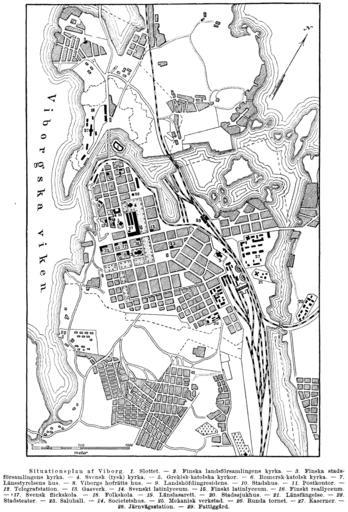 Keywords: Karta över Viborg under tidigt 1900-tal.png Legend 1 Castle 2 Church of the Finnish municipality of the surrounding county 3 Church of the Finnish municipality of the city 4 Swedish church also giving services in german 5 Greec-Catholic churches 6 Roman catholic church 7 County administration building 8 House of Viborg highest court 9 County governor's residence 10 Town hall 11 Main Post office 12 Telegraph office 13 Gasworks 14 Swedish classical high school 15 Finnish classical high school 16 Finnish 'real' practical high school 17 Swedish girls' school 18 Public elementary school 19 Communal general hospital 20 City hospital 21 County jail 22 City theater 23 Market hall 24 Hotel and restaurant 'Societetshuset' 25 Mechanical workshop 26 Medieval building 'Runda tornet' round tower 27 Military tenments 28 Railway station 29 Poor-house Karta över Viborg under tidigt 1900-tal senast 1921 Källa Nordisk familjebok 1921 band 32 sida 207-208 http //runeberg org/nfcl/0120 html 2004-06-25 page is/was http //sv wikipedia org/w/index php title Image 3AKarta_ C3 B6ver_Viborg_under_tidigt_1900-tal png here Original uploader was Den fjättrade ankan at http //sv wikipedia org sv wikipedia original upload log All user names refer to sv wikipedia 2004-06-25 00 13 Den fjättrade ankan 782×1150×8 132480 bytes <nowiki>från Nordisk familjebok</nowiki> Maps of Vyborg Maps in Swedish Vyborg in the 1900s |