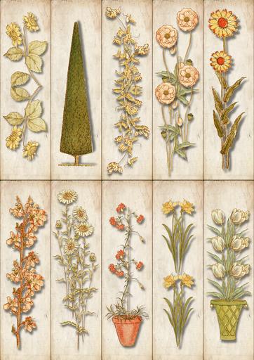 Keywords: kate greenaway vintage bookmark old fashion floral tree bush flower green yellow red orange plant flower pot planter sunflower vine leaves leaf daisy basket gift party book background template