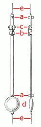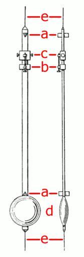 Keywords: Kater pendulum vertical.png Kater pendulum from a 1920 physics textbook Invented in 1817 by British physicist Henry Kater it was used to measure the local acceleration of gravity in geophysical surveys The labeled parts are identified in the text as a opposing knife edges on either end from which pendulum is suspended b fine adjustment weight operated by adjustment screw c coarse adjustment weight which could be moved along rod and fixed with setscrew d bob e pointers for reading Alterations to image rotated 90° CCW removed part labels and replaced with different labels in color converted from JPG to 16 color PNG Downloaded November 25 2008 from http //books google com/books id drMEAAAAMAAJ pg PA127 William Watson 1920 A Textbook of Physics 7th Ed Longman's Green Co p 127 fig 88 on Google Books William Watson 1920 Public domain Watson died in 1903 Image Kater pendulum png is a horizontal version of this image PD-old Diagrams of pendulums Gravimetry |