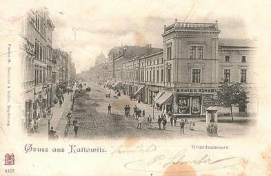 Keywords: Kattowitz - Grundmannstrasse 2.JPG Stara pocztówka Katowic przedstawiająca widok na ul 3 maja od strony Rynku PD-old UM-Katowice 3 Maja Street in Katowice Old postcards of Katowice
