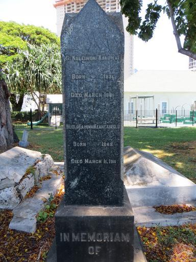 | Keywords: KawaiahaoChurchcemetery-Kapiolanifamilyplot-Kaauwai1831-81.jpg en Grave marker of G Kaleiwohi Ka ˜auwai b 1831 d March 1881 and Muolo Ka ˜auwai Keaweheulu b 1848 d 11 March 1911 in Kawaiaha ˜o Church cemetery Honolulu Hawaii These were the parents of Princess Elizabeth Kahanu KalanianaÊ»ole 2014-06-16 12 37 28 own Joel Bradshaw cc-zero Cemeteries in Hawaii KawaiahaÊ»o Church Uploaded with UploadWizard Elizabeth Kahanu KalanianaÊ»ole | ||||