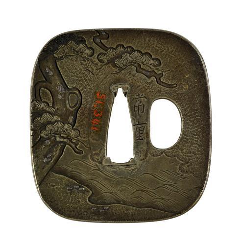 Keywords: Kawamura Tsuneshige - Tsuba with the Bell of D么j么ji - Walters 51341 - Back.jpg The scene depicted is from a story about the bell at the temple D鬸鬸i On right are two monks with prayer beads in the act of praying At the left the large bell of the temple is shown fallen from its tower A jealous woman transformed into a dragon while chasing a monk she thought had promised to marry her The monks of D鬸鬸i hid the monk in the bell tower The bell fell trapping him under it The woman in her dragon form coiled her body around the bell and breathed flames on it This killed the monk trapped inside The story is retold in noh and kabuki plays of the same name In the plays a dancer comes to the temple to celebrate the installation of a new bell She dances under the bell and when it falls on her is transformed into the dragon A pine tree and stream are shown on the reverse late Other date century 18 Edo sentoku cm 7 13 6 64 0 5 accession number 51 341 4125 Henry Walters Baltimore date and mode of acquisition unknown Walters Art Museum Henry Walters Acquired by Henry Walters Signature Tsuneshige place of origin Edo present-day Tokyo Japan Walters Art Museum license Tsuba in the Walters Art Museum Kawamura Tsuneshige Media contributed by the Walters Art Museum needs category review |