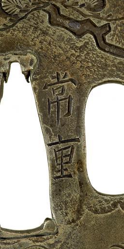 Keywords: Kawamura Tsuneshige - Tsuba with the Bell of D么j么ji - Walters 51341 - Mark A.jpg The scene depicted is from a story about the bell at the temple D鬸鬸i On right are two monks with prayer beads in the act of praying At the left the large bell of the temple is shown fallen from its tower A jealous woman transformed into a dragon while chasing a monk she thought had promised to marry her The monks of D鬸鬸i hid the monk in the bell tower The bell fell trapping him under it The woman in her dragon form coiled her body around the bell and breathed flames on it This killed the monk trapped inside The story is retold in noh and kabuki plays of the same name In the plays a dancer comes to the temple to celebrate the installation of a new bell She dances under the bell and when it falls on her is transformed into the dragon A pine tree and stream are shown on the reverse late Other date century 18 Edo sentoku cm 7 13 6 64 0 5 accession number 51 341 4125 Henry Walters Baltimore date and mode of acquisition unknown Walters Art Museum Henry Walters Acquired by Henry Walters Signature Tsuneshige place of origin Edo present-day Tokyo Japan Walters Art Museum license Tsuba in the Walters Art Museum Kawamura Tsuneshige Media contributed by the Walters Art Museum needs category review |