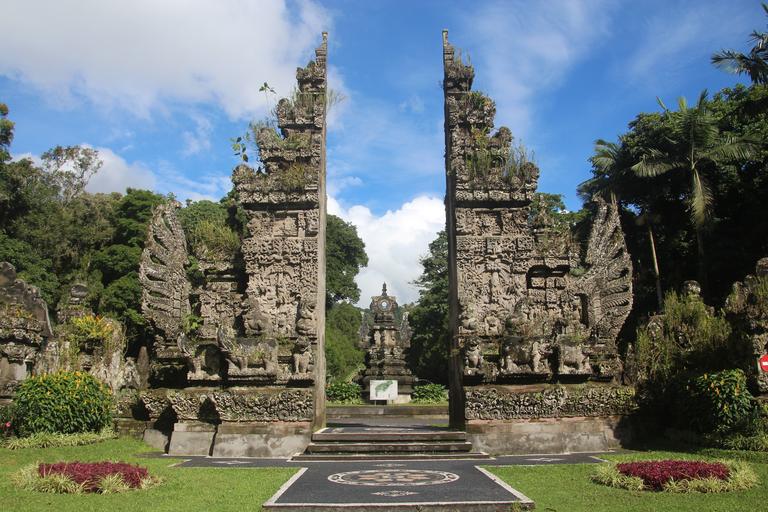 | Keywords: Kebun Raya Bali Candi Bentar IMG 8794.jpg en The Bentar monument candi bentar makes up the main gate of the Bali Botanic Garden The shape of the split gate symbolises two large doors Kori Agung The Bentar monument also symbolises a mountain On the main gate walls are reliefs of Indonesian flora and fauna symbolising the harmony between nature and human relationships the Balinese Hindu community The plant carvings include flowers of ixora pandan rice cotton coconut ferns grass and foliage The animal carvings include elephants lions tigers deer monkeys birds bats cows pigs and dragons 2016-12-14 08 36 55 own KRBali other versions cc-zero Botanical gardens Candi bentar |