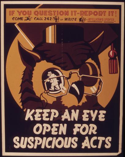 | Keywords: "Keep an eye open for suspicious acts." - NARA - 514758.jpg Scope and content General notes 514758 Local identifier 44-PA-1162 Office for Emergency Management Office of War Information Domestic Operations Branch Bureau of Special Services 03/09/1943 - 09/15/1945 Still Picture Records Section Special Media Archives Services Division NWCS-S National Archives at College Park 8601 Adelphi Road College Park MD 20740-6001 1941 - 1945 Record group Record Group 44 Records of the Office of Government Reports 1932 - 1947 Record group ARC 373 World War II Posters compiled 1942 - 1945 Series ARC 513498 File unit File unit ARC Variant control numbers NAIL Control Number NWDNS-44-PA-1162 Other versions <gallery> File Keep_an_eye_open_for_suspicious_acts _-_NARA_-_514758 tif tif File Keep_an_eye_open_for_suspicious_acts _-_NARA_-_514758 jpg jpg </gallery> NARA-cooperation PD-USGov World War II posters from the United States Owls in art |