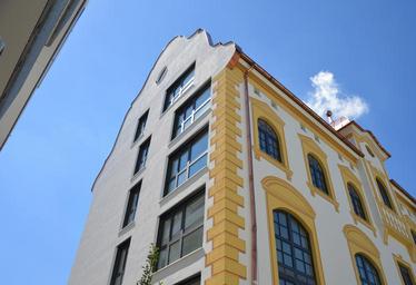 Keywords: kempten brewhouse architecture tower house glass mirroring cloud sky town home roofs downtown urban planning live and work