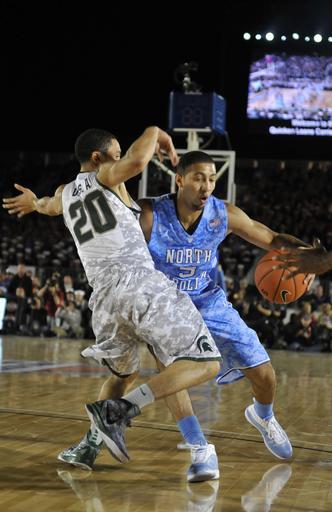 | Keywords: Kendall Marshall Travis Trice.jpg en SAN DIEGO Nov 11 2011 University of North Carolina guard Kendall Marshall 5 drives the ball against Michigan State guard Travis Trice 20 during the Quicken Loans Carrier Classic basketball game aboard the Nimitz-class aircraft carrier USS Carl Vinson CVN 70 The inaugural Carrier Classic is a celebration of Veterans Day U S Navy photo by Mass Communication Specialist 3rd Class Roza Arzola/Released 2011-11-11 111111-N-OK922-832 Navy http //www navy mil/view_image asp id 110216 U S Navy photo by Mass Communication Specialist 3rd Class Roza Arzola PD-USGov-Military-Navy Carrier Classic Kendall Marshall 2011 “12 NCAA Division I men's basketball season |