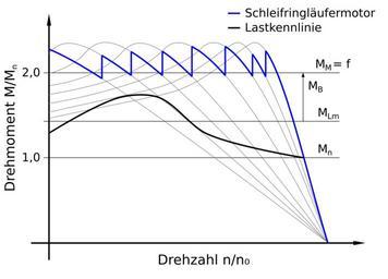 | Keywords: Kennlinie schleifringläufer schweranlauf.svg de de Anlassschwere<br/> M<sub>M</sub> Mittleres Anlassmoment <br/> M<sub>n</sub> Nenndrehmoment <br/> M<sub>Lm</sub> Mittleres Lastmoment <br/> M<sub>B</sub> Resultierendes Beschleunigungsmoment<br/> n<sub>0</sub> Netzfrequenz<br/> Own Biezl Inkscape Electric motor graphs |