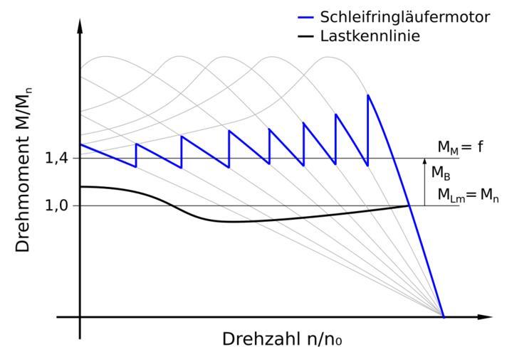 | Keywords: Kennlinie schleifringläufer volllast.svg de de Anlassschwere<br/> M<sub>M</sub> Mittleres Anlassmoment <br/> M<sub>n</sub> Nenndrehmoment <br/> M<sub>Lm</sub> Mittleres Lastmoment <br/> M<sub>B</sub> Resultierendes Beschleunigungsmoment<br/> n<sub>0</sub> Netzfrequenz<br/> Own Biezl Inkscape Electric motor graphs |