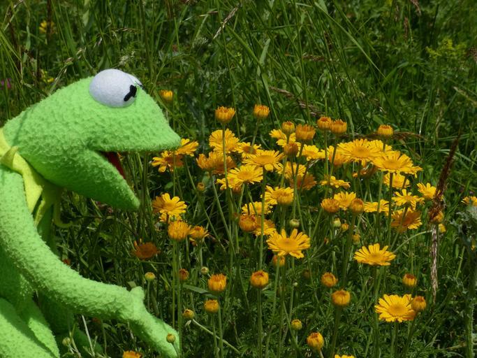 | Keywords: kermit frog to watch admire beautiful flowers bloom yellow wild flowers wild plant anthemis tinctoria cota tinctoria dyer hundskamille composites asteraceae faerberpflanze flower basket golden yellow tongue flower tubular flowers pointed flower |