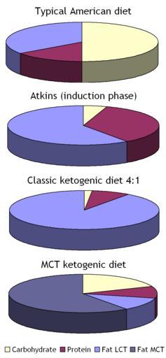 Keywords: Ketogenic diets pie.png Ketogenic diets pie svg A series of pie charts depicting the calorific contributions from carbohydrate protein and fat in four diets the typical American diet; the Atkins diet during the induction phase; the classic ketogenic diet in a 4 1 ratio of fat to combined protein and carbohydrate by weight ; and the MCT oil ketogenic diet Sources Last AR Wilson SA http //www aafp org/afp/20060601/1942 html Low-carbohydrate diets Am Fam Physician 2006 Jun 1;73 11 1942-8 PMID 16770923 Huttenlocher PR Wilbourn AJ Signore JM Medium-chain triglycerides as a therapy for intractable childhood epilepsy Neurology 1971 Nov;21 11 1097-103 PMID 5166216 http //www shsna com/pages/ketocal htm SHS KetoCal Cited 18 March 2008 Data values carbohydrate protein fat LCT and fat MCT Percentage of calories Typical American 50 15 35 0 Atkins induction phase 5 35 59 0 Classic ketogenic 1 6 8 4 90 0 MCT ketogenic 19 10 11 60 Own 2008-03-18 Colin Nutrition |
