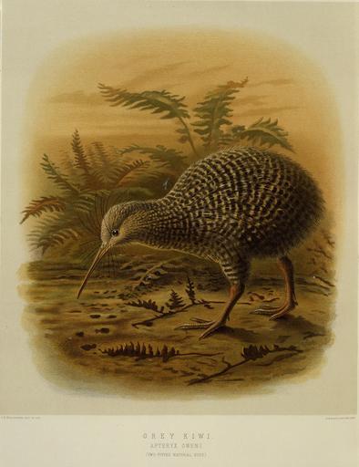 | Keywords: Shows grey kiwi viewed from the side, with ferns growing in the background Inscriptions: Inscribed - Recto - bottom right: Judd & Co. Limited, Imp.. Quantity: 1 colour art print(s) in book.. Physical Description: Chromolithograph, 264 x 224 mm Keulemans, John Gerrard, 1842-1912. Keulemans, John Gerrard, 1842-1912 :Grey kiwi. Apteryx oweni. (two-fifths natural size). / J. G. Keulemans delt. & lith. [Plate XLVIII 1888].. Buller, Walter Lawry (Sir) 1838-1906 :A history of the birds of New Zealand. 2d ed. London, John van Voorst, 1888.. Ref: PUBL-0012-48. Alexander Turnbull Library, Wellington, New Zealand. natlib.govt.nz/records/22511324 Shows grey kiwi viewed from the side, with ferns growing in the background Inscriptions: Inscribed - Recto - bottom right: Judd & Co. Limited, Imp.. Quantity: 1 colour art print(s) in book.. Physical Description: Chromolithograph, 264 x 224 mm Keulemans, John Gerrard, 1842-1912. Keulemans, John Gerrard, 1842-1912 :Grey kiwi. Apteryx oweni. (two-fifths natural size). / J. G. Keulemans delt. & lith. [Plate XLVIII 1888].. Buller, Walter Lawry (Sir) 1838-1906 :A history of the birds of New Zealand. 2d ed. London, John van Voorst, 1888.. Ref: PUBL-0012-48. Alexander Turnbull Library, Wellington, New Zealand. natlib.govt.nz/records/22511324 |